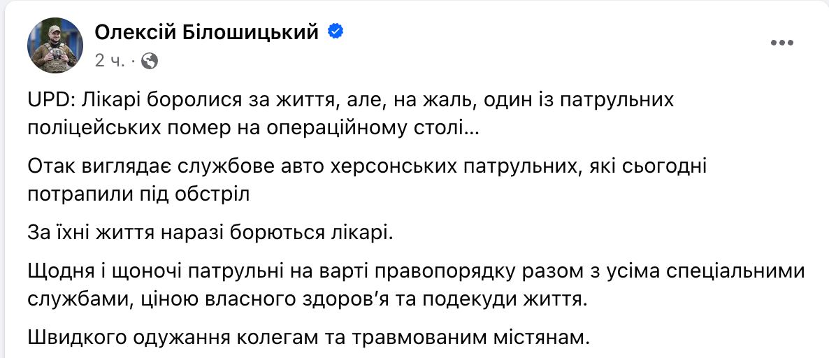 В Херсоне скончался патрульный, который был ранен в ходе утреннего артиллерийского обстрела.