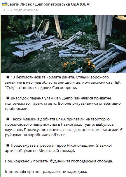 За время воздушной атаки РФ над Днепропетровской областью уничтожили 13 беспилотников и крылатую ракету.