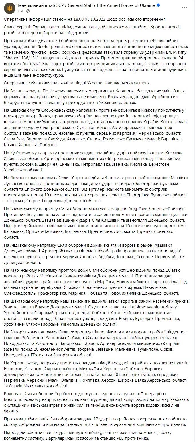 Генштаб ВСУ опубликовал оперативную информацию о ситуации на фронте по состоянию на 18:00 5 октября.