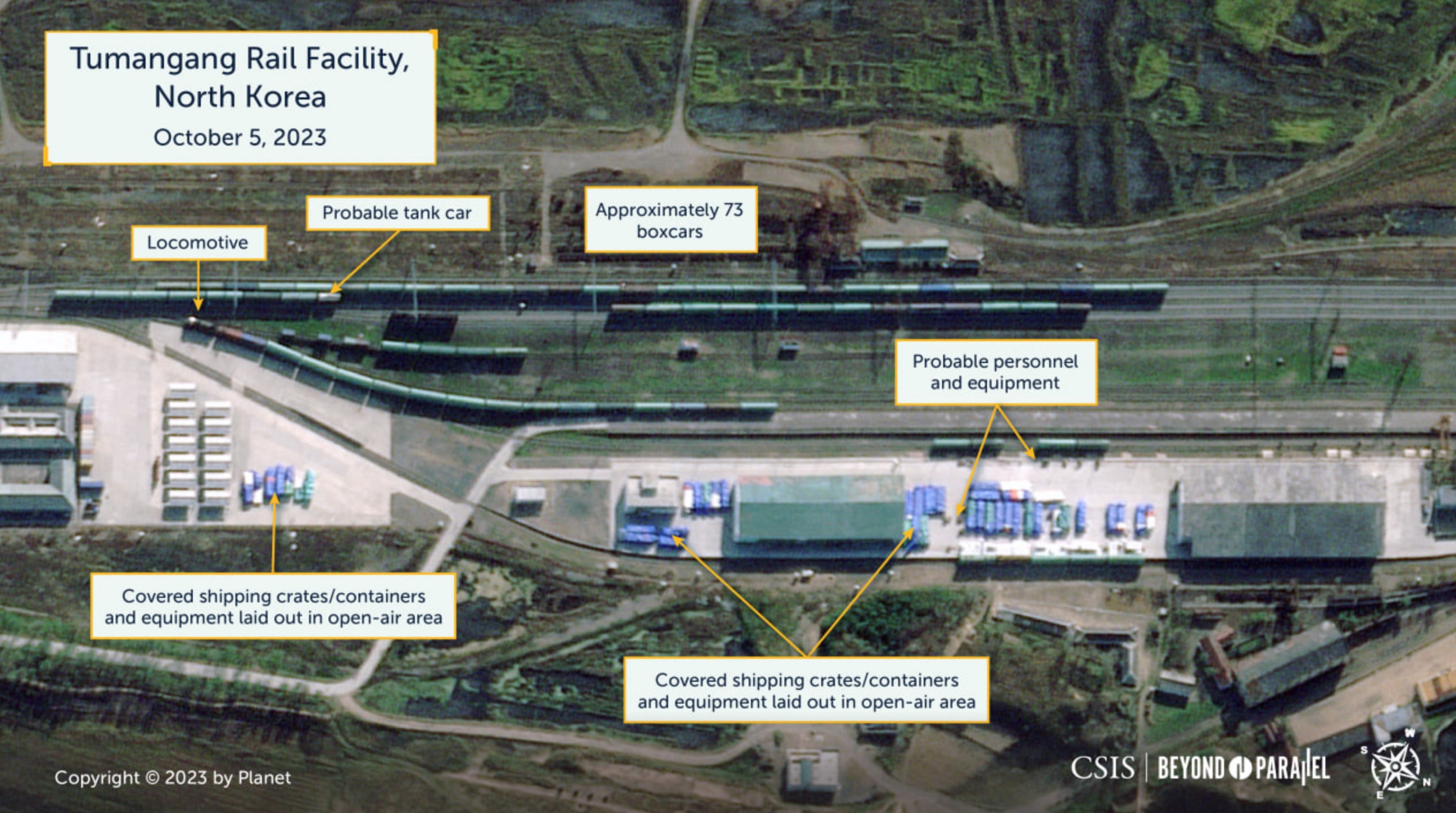 Спутниковые снимки железнодорожного пункта Туманган на границе КНДР с РФ показывают "беспрецедентное количество" грузовых вагонов за 5 октября - около 73 вагонов. Этот уровень намного превышает тот, который Beyond Parallel наблюдал за последние пять лет, даже до Covid-19.