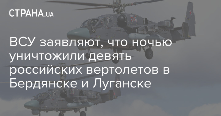 ВСУ заявляют, что ночью уничтожили девять российских вертолетов разных модификаций на аэродромах в Бердянске и Луганске.