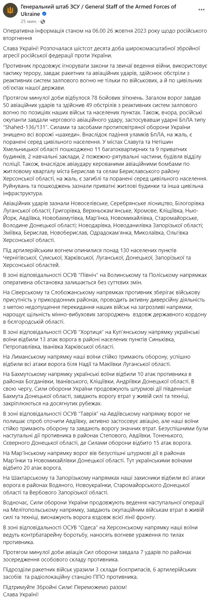 За прошедшие сутки произошло 78 боевых столкновений. Всего Россия нанесла 50 авиаударов и совершила 49 обстрелов из реактивных систем огня по позициям наших войск и населенным пунктам.