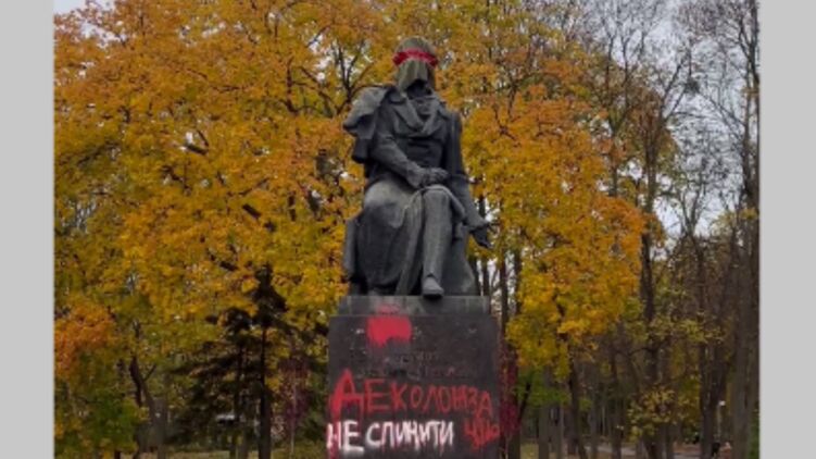 В Киеве неизвестные обмотали голову памятника русскому поэту Александру Пушкину и сделали на нем надпись на украинском языке "Деколонизацию не остановить".