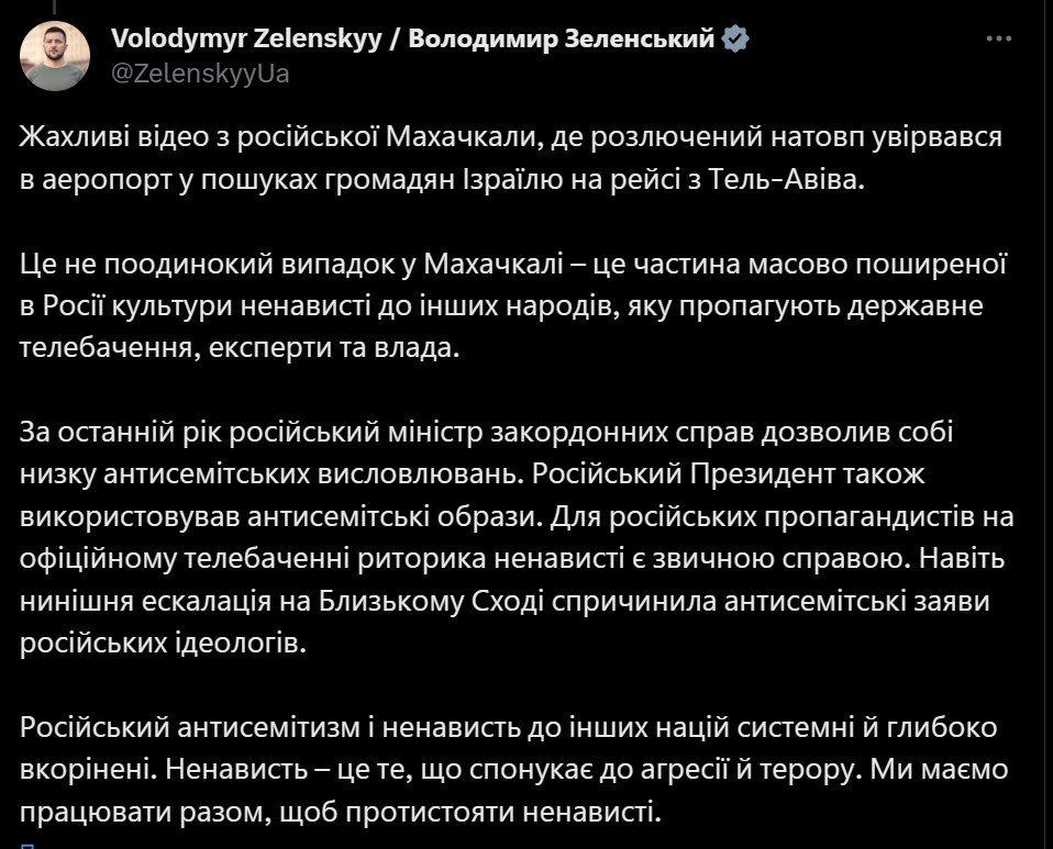 Также, по словам Зеленского, "это не редкий случай в Махачкале – это часть массово распространенной в России культуры ненависти к другим народам, пропагандируемая государственным телевидением, экспертами и властью".