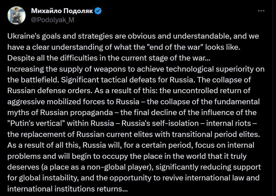 "Цели и стратегия Украины очевидны и понятны, и у нас есть четкое понимание того, как будет выглядеть "конец войны", - написал советник главы ОП Михаил Подоляк в соцсети X (ранее Twitter).