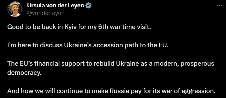 Фон дер Ляйен в своем Х сообщила, что приехала обсуждать путь вступления Украины в ЕС, финансовую поддержку и санкции против России.