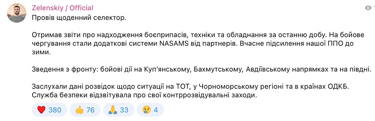 "Получил отчеты о поступлении боеприпасов, техники и оборудования за последние сутки. На боевое дежурство встали дополнительные системы NASAMS от партнеров. Своевременное усиление нашей ПВО к зиме", - написал президент.