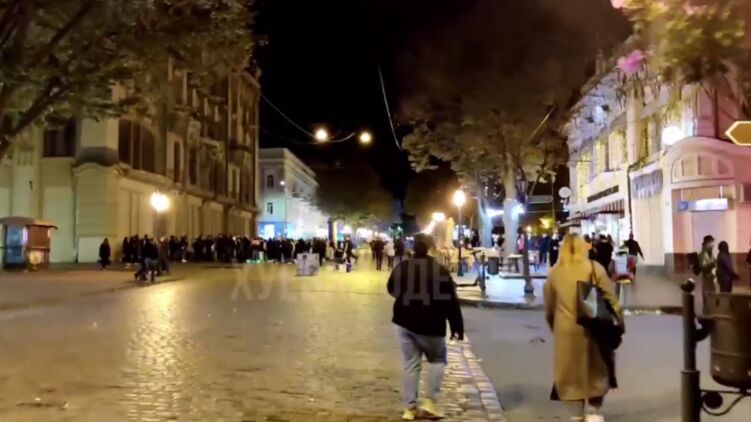 В сети появилось видео из Одессы, как на улице Дерибасовской во время тревоги и взрывов массово гуляют люди и проходит уличный концерт.