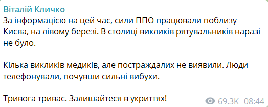 Мэр Киева Виталий Кличко сообщил, что силы ПВО работали вблизи Киева, на левом берегу.