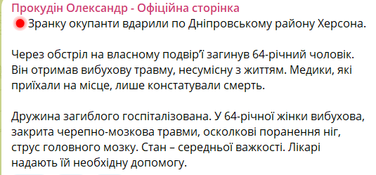 "Из-за обстрела на собственном дворе погиб 64-летний мужчина. Он получил взрывную травму, несовместимую с жизнью. Приехавшие на место медики лишь констатировали смерть", - написал он.