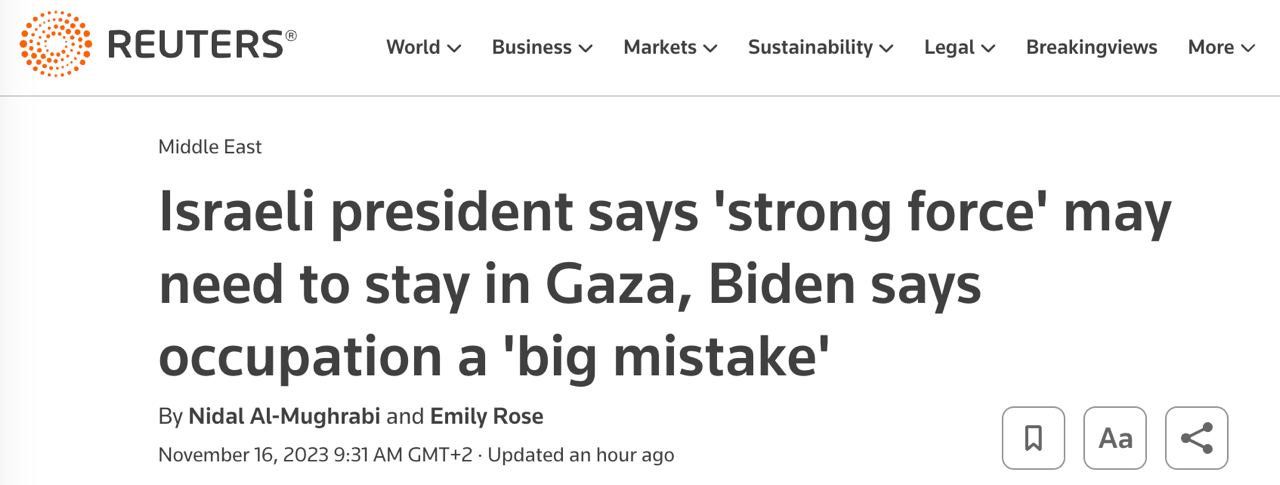 Между тем в Израиле придерживаются противоположной точки зрения. Накануне президент страны Исаак Герцог заявил, что "очень сильные силы", возможно, должны остаться в секторе Газа в ближайшем будущем, чтобы предотвратить повторное появление группировки ХАМАС после войны.