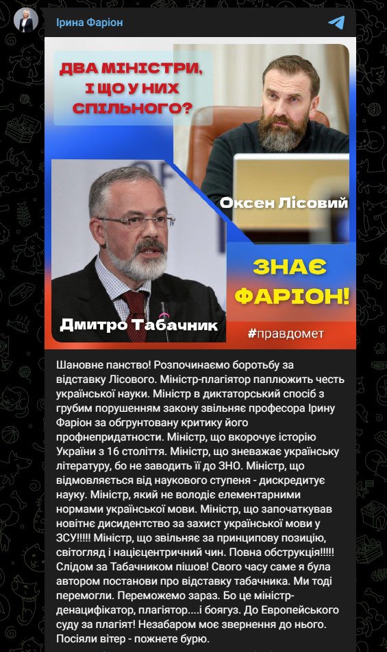 Фарион напомнила, что ранее была автором постановления Верховной Рады об отставке министра образования Дмитрия Табачника.
