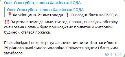Во вторник, 21 ноября, около 6 утра РФ ударила по поселку Казачья Лопань в Харьковской области.