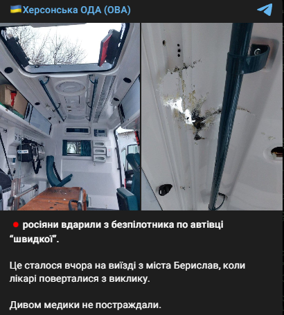 На выезде из Берислава Херсонской области беспилотник нанес удар по машине скорой помощи.