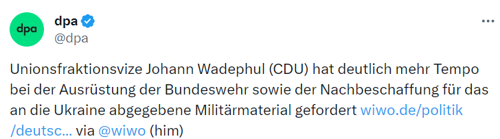 Кроме того, Вадефуль назвал недопустимой ситуацию, при которой бундесвер не способен компенсировать переданную Украине технику и боеприпасы.