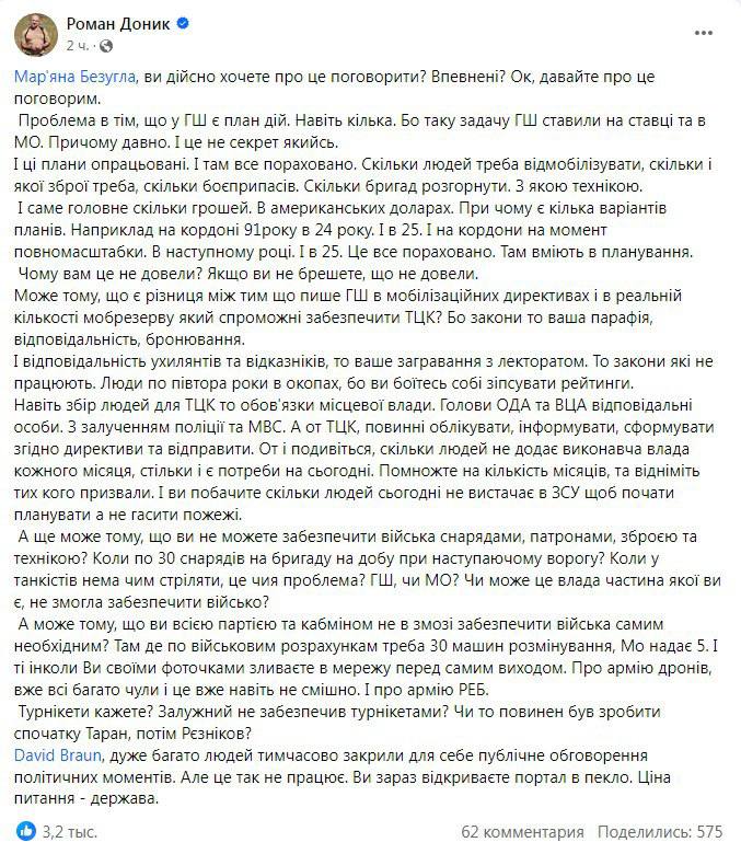 "Может быть, есть разница между тем, что пишет Генштаб в мобилизационных директивах, и в реальном количестве мобрезерва, который способны обеспечить ТЦК? Ибо законы - это ваша ответственность. И ответственность уклоняющихся и отказников - это ваше заигрывание с электоратом. Даже сбор людей для ТЦК - это обязанности местных властей. Председатели ОГА и ВГА ответственные лица. Вот и посмотрите, сколько людей не додает исполнительная власть каждый месяц, столько и есть нужды сегодня. Столько людей сегодня не хватает в ВСУ, чтобы начать планировать, а не тушить пожары", - пишет Доник.