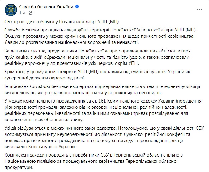 "Обыски проходят в рамках уголовного производства о причастности руководства лавры к разжиганию национальной вражды и ненависти. По данным следствия, представители Почаевской лавры обнародовали на сайте монастыря публикацию, в которой оскорбляли национальную честь и достоинство иудеев, а также разжигали религиозную рознь против представителей всех церквей, кроме УПЦ", - говорится в посте СБУ.