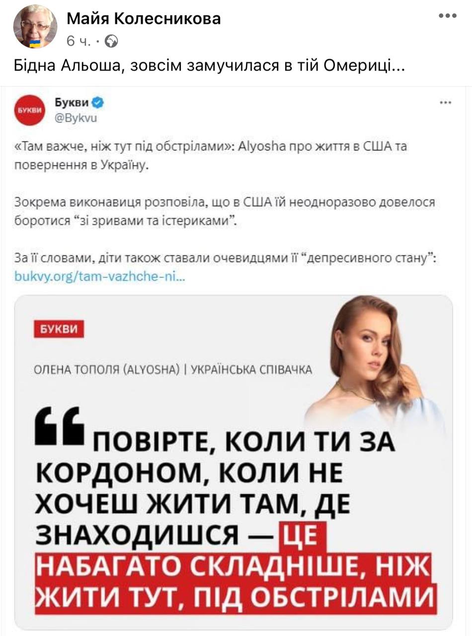 Жена лидера группы "Антитела" Тараса Тополи, певица Alyosha, которая недавно вернулась из США, заявила, что жизнь за границей труднее, чем в Украине под обстрелами.