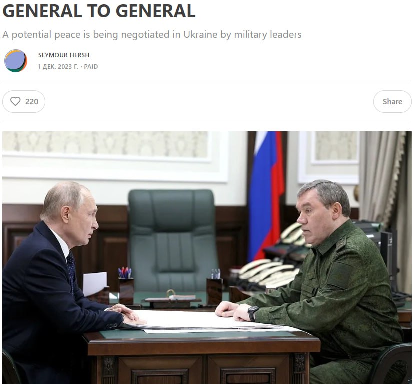 Американский журналист Сеймур Херш утверждает со ссылкой на анонимных чиновников США, что Россия и Украина якобы ведут тайные мирные переговоры по линии высокопоставленных военных Валерия Герасимова и Валерия Залужного, несмотря на возражения Владимира Зеленского.