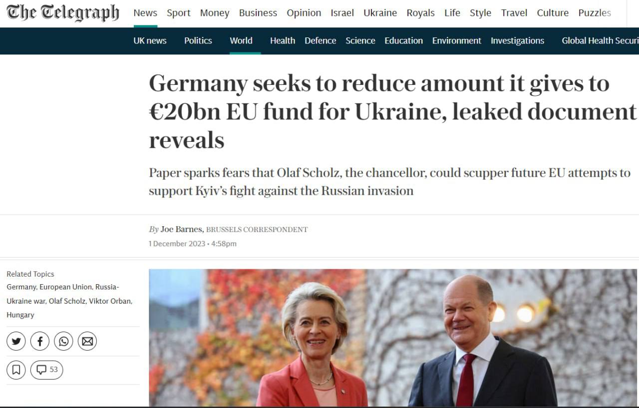 В конфиденциальном документе Берлин просит Европейский фонд мира принять во внимание миллиарды долларов военной помощи, которые Германия пожертвовала Киеву на двусторонней основе.
