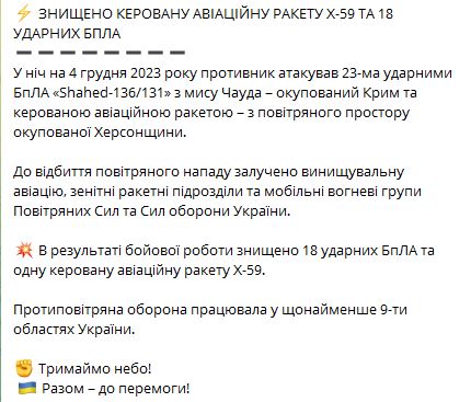 В ночь на 4 декабря силы ПВО уничтожили управляемую авиационную ракету Х-59 и 18 российских беспилотников.