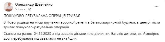 Было найдено тело девочки. Ее родителей еще ищут. Предположительно, они тоже могут быть под завалами многоэтажки, разрушенной ракетным ударом РФ ночью 29 ноября.