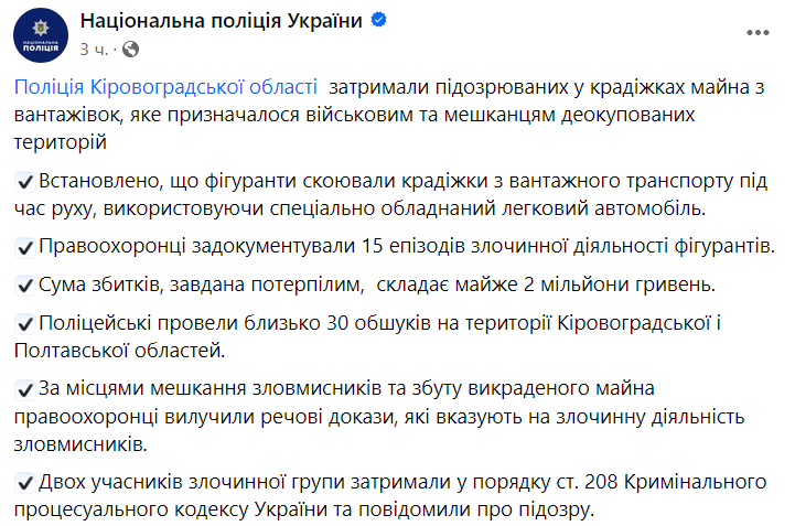 По данным полиции, имущество из грузовиков предназначалось военным и жителям деоккупированных территорий.