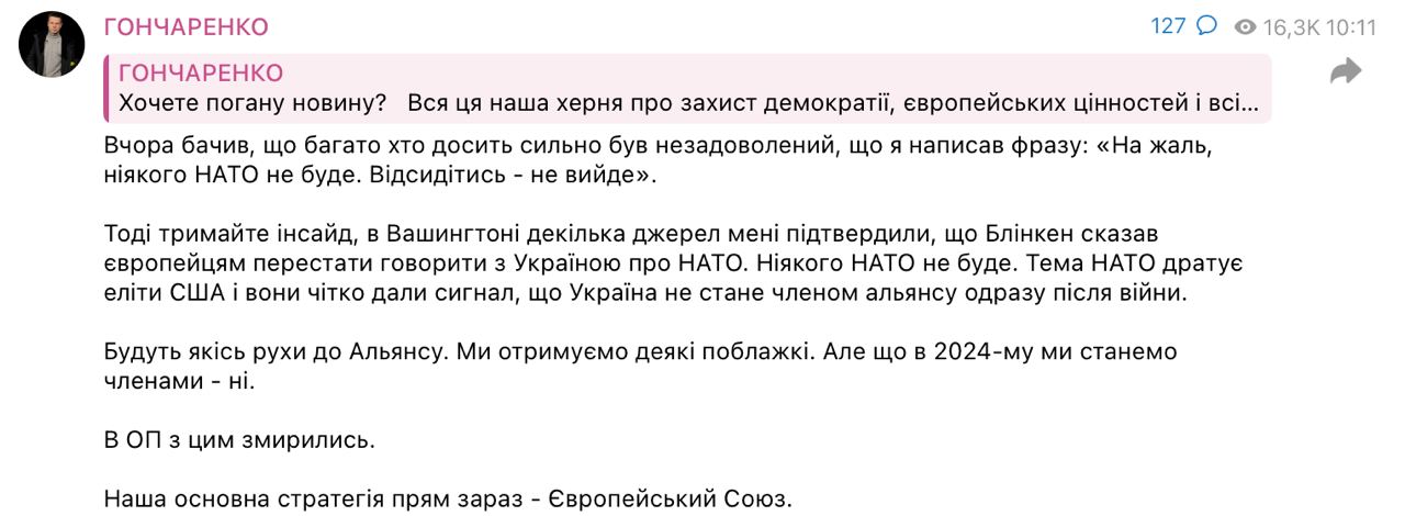 "Никакого НАТО не будет. Тема НАТО раздражает элиты США и они четко дали сигнал, что Украина не станет членом альянса сразу после войны. Будут какие-то движения в Альянс. Мы получаем некоторые снисхождения. Но то, что в 2024-м мы станем членами, – нет", - пишет Гончаренко.