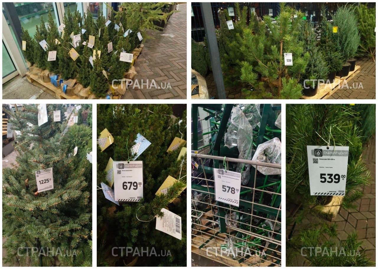 При входе в магазин располагается ряд с "живыми" деревьями. Совсем маленькие елки можно купить почти за 700 грн. А вот деревья высотой больше метра обойдутся дороже — в 1225 грн. Самый бюджетный вариант — сосна, стоимость которой немного превышает 500 грн.