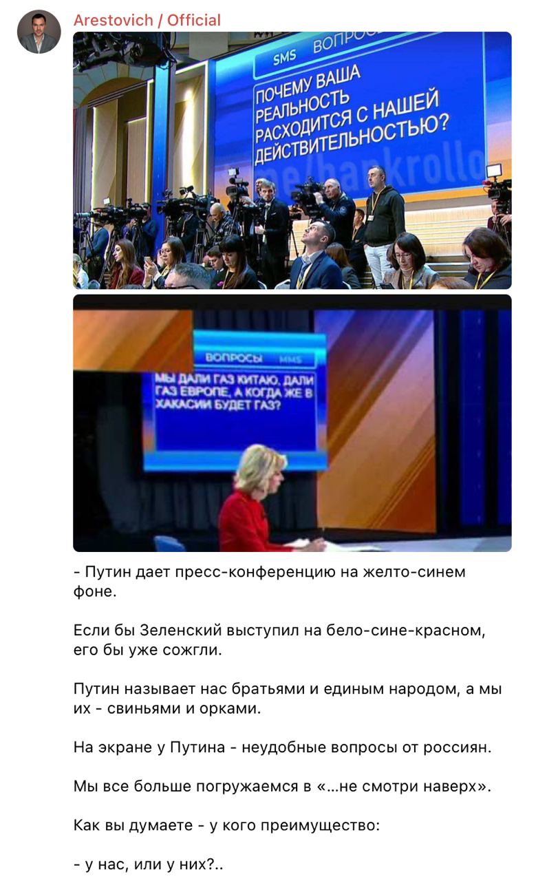 "Путин дает пресс-конференцию на желто-синем фоне. Если бы Зеленский выступил на бело-сине-красном, его бы уже сожгли. Путин называет нас братьями и единым народом, а мы их — свиньями и орками. На экране у Путина — неудобные вопросы от россиян. Мы все больше погружаемся в "...не смотри наверх". Как вы думаете — у кого преимущество: — у нас, или у них?..", — написал Арестович.