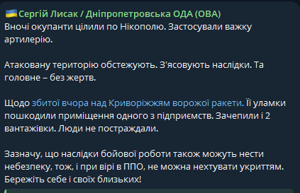 "Насчет сбитой вчера над Криворожьем вражеской ракеты. Ее обломки повредили помещение одного из предприятий. Зацепили и 2 грузовика. Люди не пострадали", - сообщил Лысак.