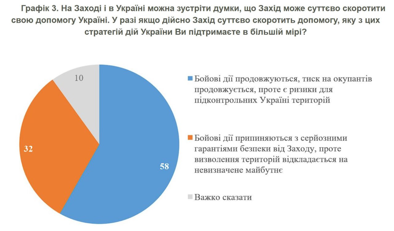 При этом большинство опрошенных украинцев - 58% - высказались за продолжение войны, даже если Запад существенно сократит поддержку Украины, и есть риск потерять новые территории.