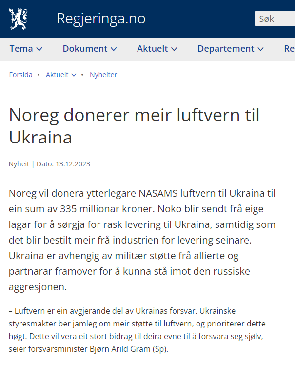 "Сегодня Норвегия объявляет о дополнительной поддержке Украины. Противовоздушная оборона является решающей частью обороны Украины. Украинская власть всегда требует большей поддержки противовоздушной обороны и отдает этому преимущество", - подчеркнул министр обороны Норвегии Бьорн Арильд Грамм.