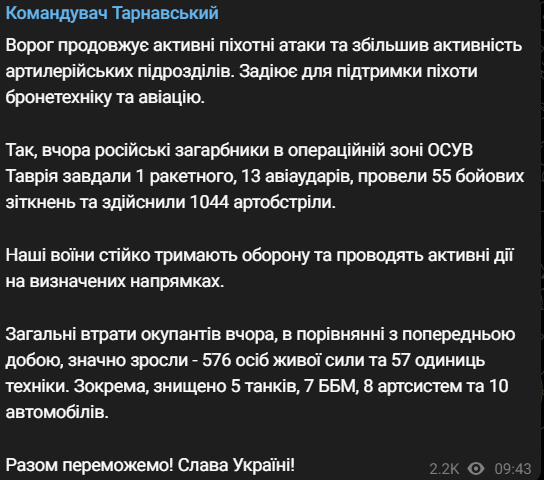 "Вчера российские захватчики в операционной зоне ОСУВ Таврия нанесли 1 ракетный, 13 авиаударов, провели 55 боевых столкновений и осуществили 1044 артобстрела", - написал Тарнавский.