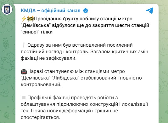 "Сейчас состояние тоннеля между станциями метро "Демеевская"-"Лыбедская" стабилизировано и полностью контролируется. Профильные специалисты проводят работы по обустройству усиливающих конструкций и локализации течей. Появления новых деформаций и трещин не наблюдается", - заверили в КГГА.