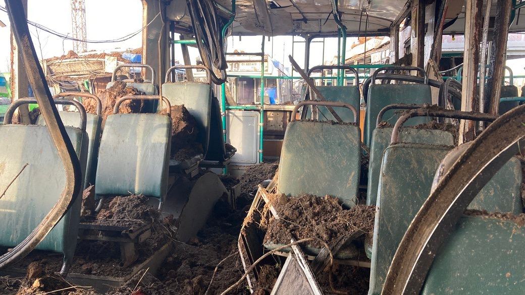 Видно, что на месте удара образовалась огромная воронка. Поврежден общественный транспорт.