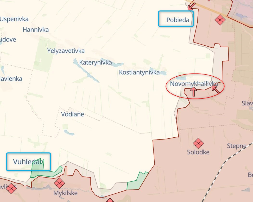 Украинский телеграм-канал Deep State уточняет, что РФ закрепляется на кладбище, ферме и складах под Новомихайловкой. Следующий этап - штурм самого села, полагает паблик (российские телеграм-каналы утверждают, что штурм Новомихайловки уже начался). Захват Победы и Новомихайловки позволит россиянам развернуть наступление с северо-востока на Угледар.