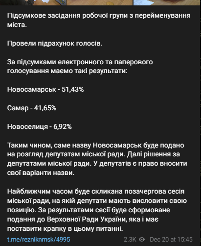 Жители Новомосковска выбрали новое название для города: победителем стало название Новосамарск, набравшее 51,43% голосов. Другими вариантами были Самар (41,65%) и Новоселица (6,92%).