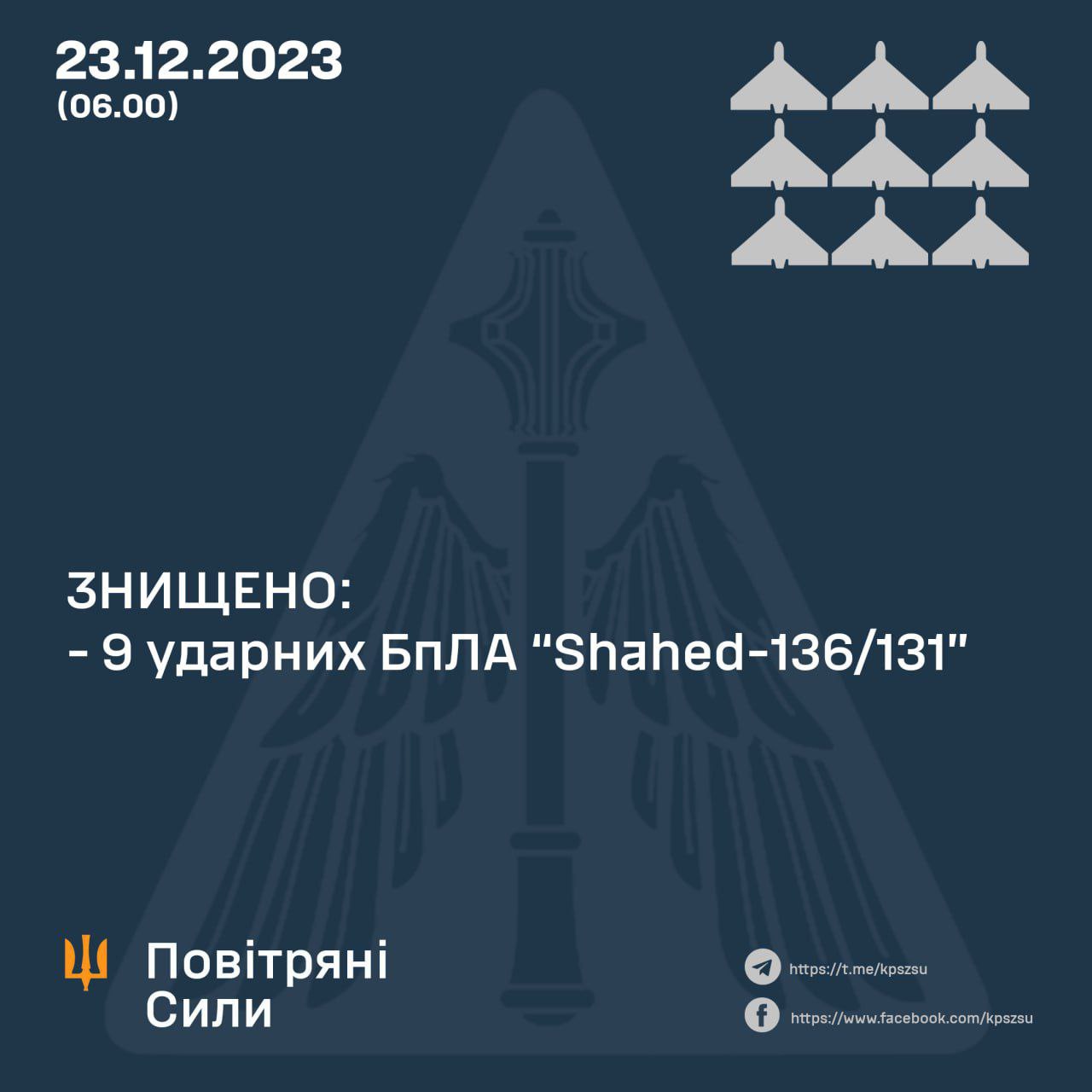 За эту ночь ВСУ, как сообщает командование Воздушных сил, сбило все 9 запущенных "Шахедов".