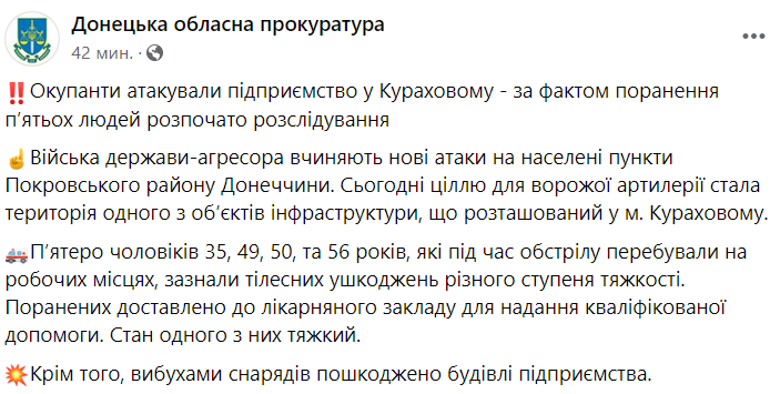 По данным Донецкой областной прокуратуры, атакованный РФ объект энергетики - это Кураховская ТЭС. Пострадавшие энергетики - мужчины от 35 до 56 лет. В Минэнерго сообщали, что на ТЭС остановлен энергоблок.