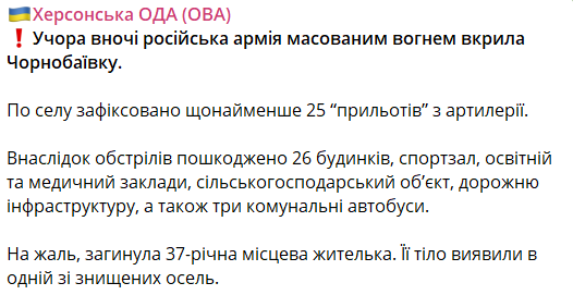 11:26 В Чернобаевке (пригород Херсона) ночью было 25 прилетов из артиллерии, погибла женщина.