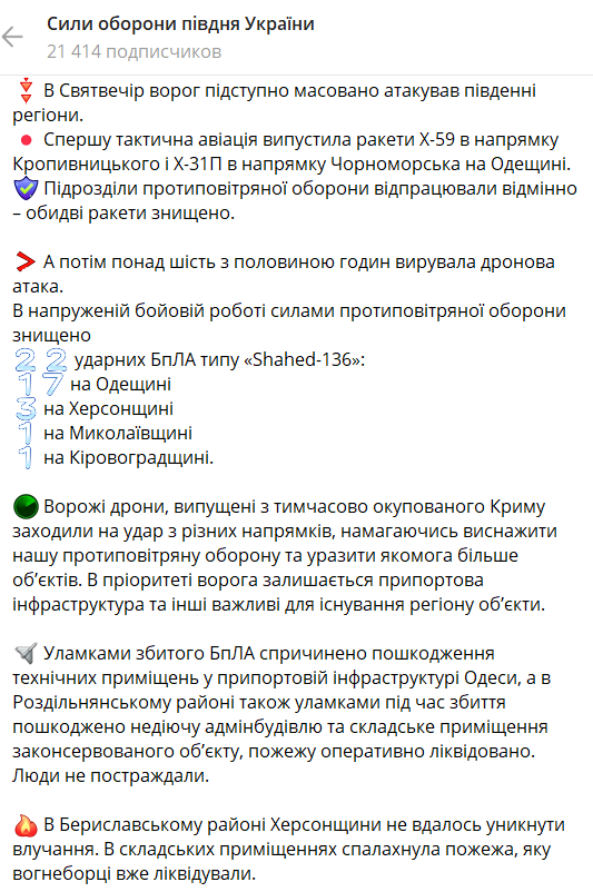 Сообщается, что сначала тактическая авиация выпустила ракеты Х-59 в направлении Кропивницкого и Х-31П в направлении Черноморска Одесской области. Силами ПВО сбиты обе ракеты.