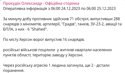 10:00 За минувшие сутки россияне совершили 71 обстрел, выпустив 288 снарядов из минометов, артиллерии, "Градов", танков, ЗУ-23-2, авиации и БПЛА, из них - 6 "Shahed". По городу Херсон враг выпустил 16 снарядов.