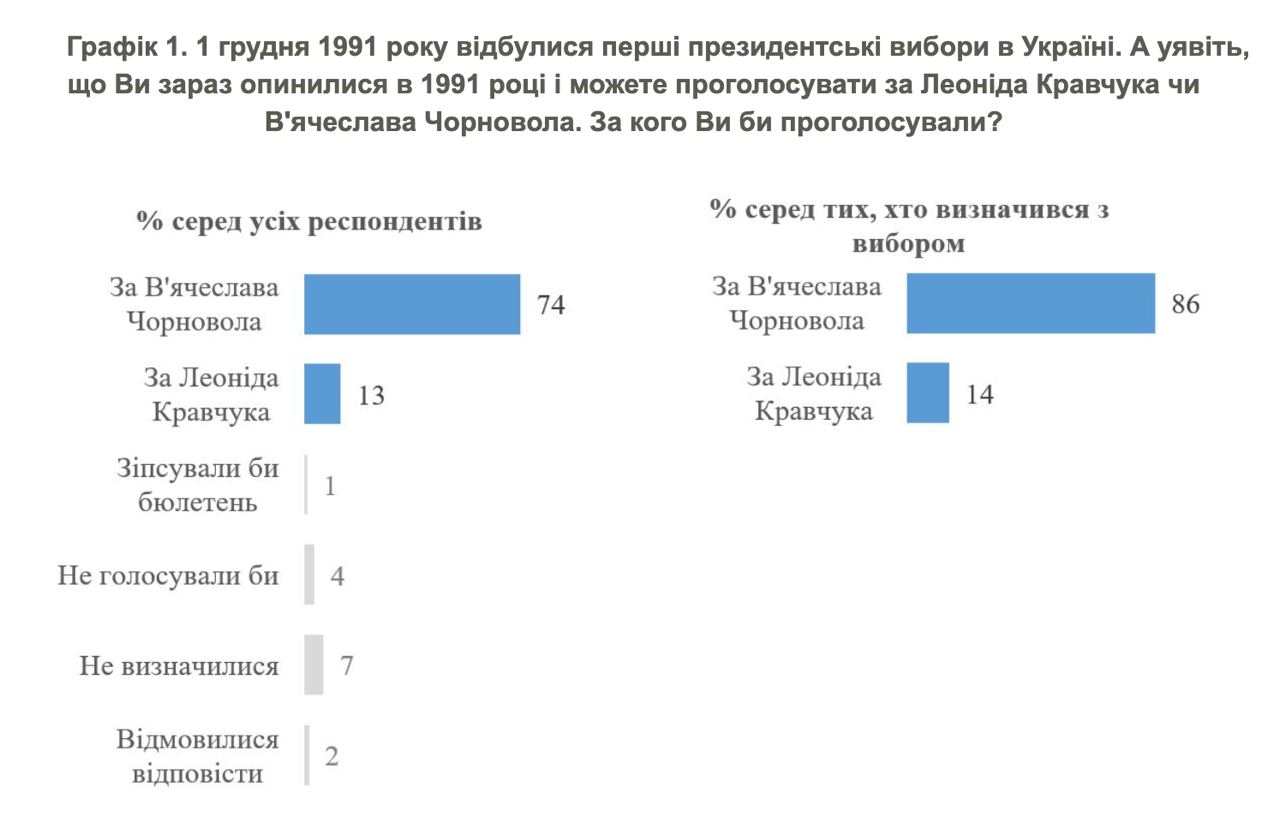 Среди тех, кто в 1991 году имел право голоса, разница еще большая - 81% Черновола и 10% – за Кравчука.