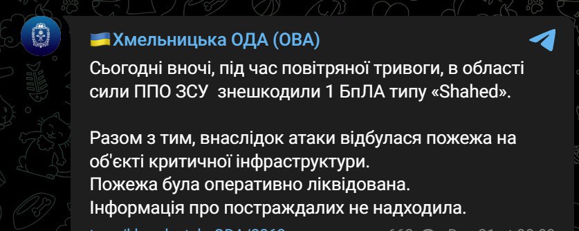 "Сегодня ночью во время воздушной тревоги в области силы ПВО ВСУ обезвредили 1 БПЛА типа "Shahed". В то же время в результате атаки произошел пожар на объекте критической инфраструктуры" - говорится в сообщении.