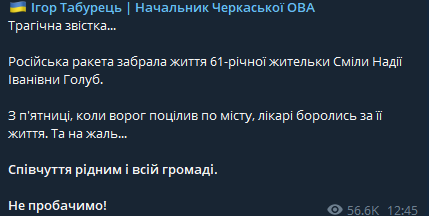 "Трагическое известие. Российская ракета унесла жизни 61-летней жительницы Смелы Надежды Ивановны Голуб. С пятницы, когда враг попал по городу, врачи боролись за ее жизнь", - написал Табурец.