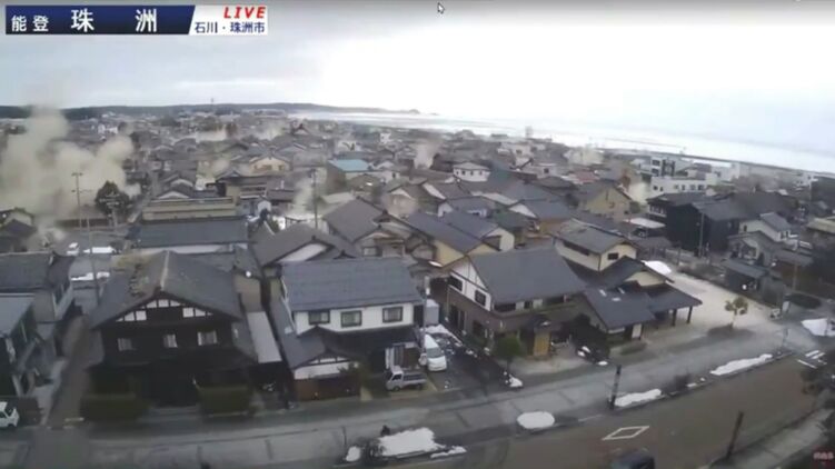 Камера видеонаблюдения на здании одного из местных телеканалов Hokuriku Asahi Broadcasting, ведущая непрерывную трансляцию в Интернет, зафиксировала обрушение нескольких зданий в прибрежном районе.