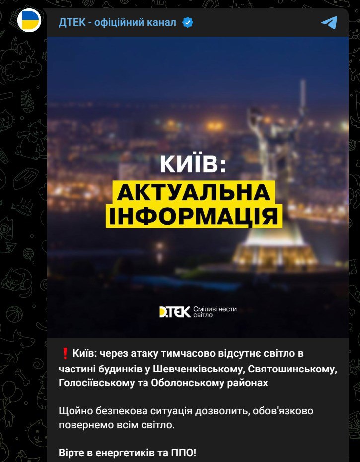 08.13 ДТЭК сообщает, что в Киеве сейчас частично нет света в Шевченковском, Святошинском, Голосеевском и Оболонском районах