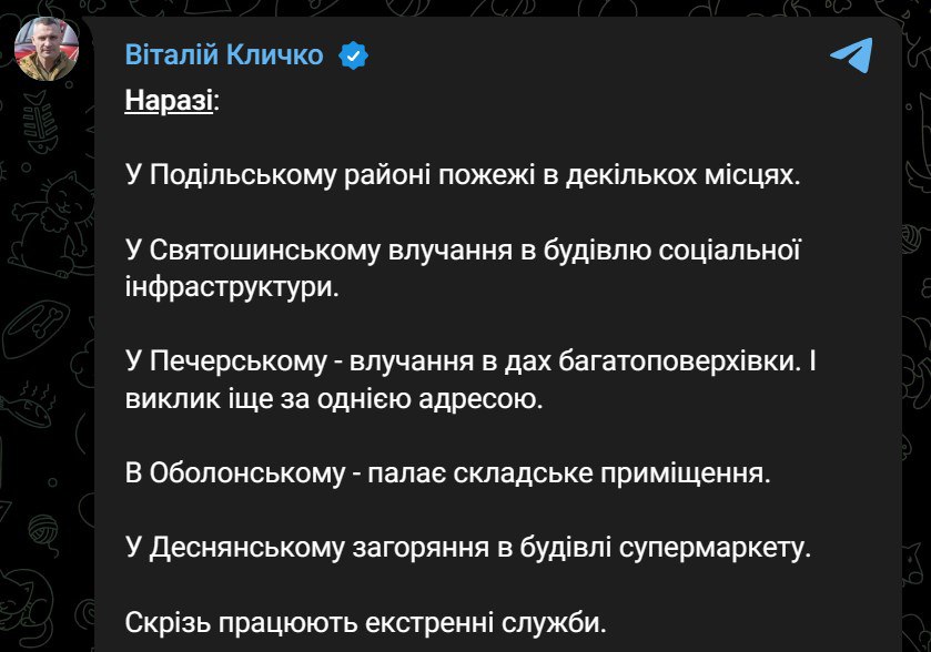 08.10 Военная администрация Киева подтверждает, что в Печерском районе два прилета по многоэтажкам - "на крышу 9-ти этажного жилого дома + на еще один многоэтажный дом".