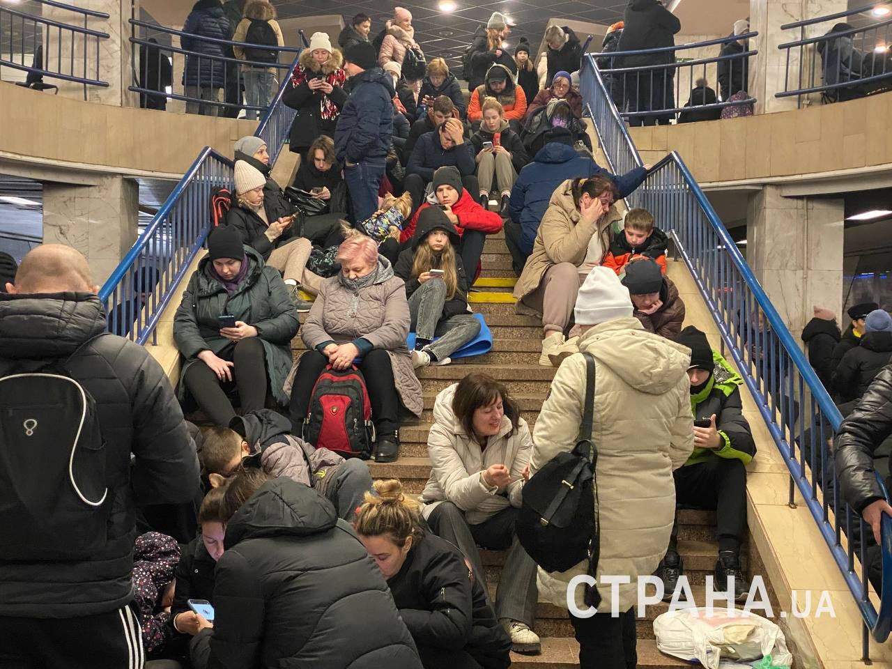 09.15 Обстановка в Киевском метро. Многие спускаются в подземку чтобы там переждать обстрелы.